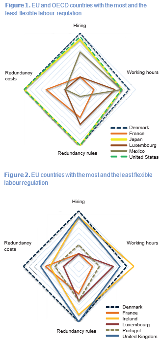 In the European Union, the most flexible regulation is in Denmark, the United Kingdom and Ireland, and the least flexible in France, Luxembourg and Portugal (see Figure 2). The top three countries allow fixed-term contracts for permanent tasks and do not restrict redundancies and working time. On the contrary, the most restrictive countries either prohibit fixed-term contracts for permanent tasks or cap the maximum length of such contracts, restrict work on weekly holidays, and require employees to notify a third party before dismissing employees, retrain or reassign them before redundancies and apply priority rules to reemployment.