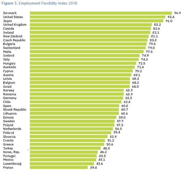 Note: Countries with flexible employment regulation merit higher scores in the index.